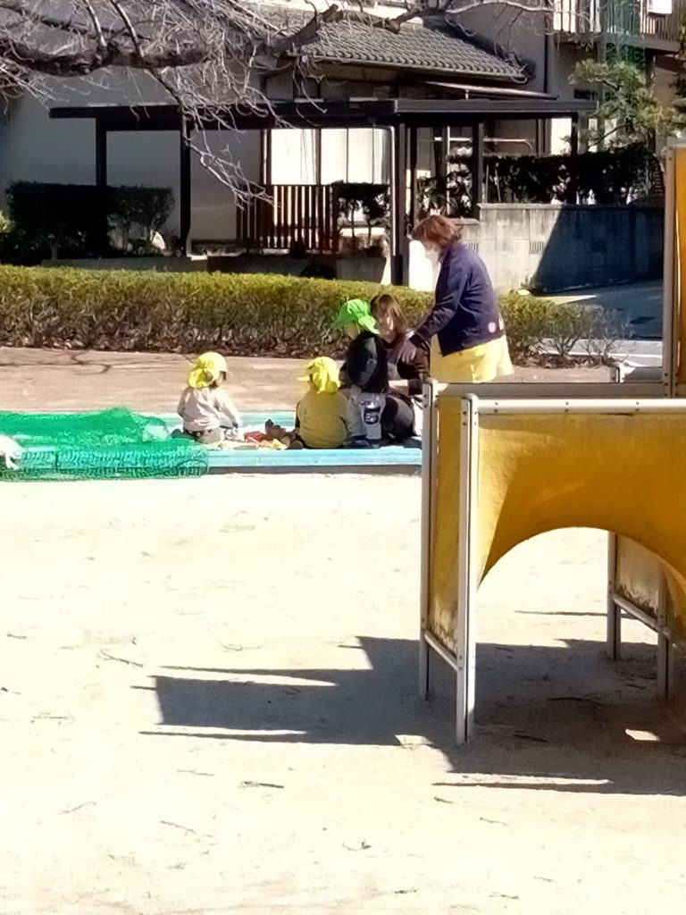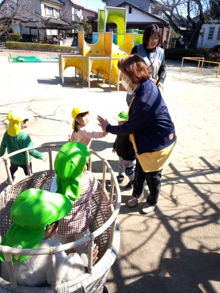 ばなな組さんの遊びが気になり、近くまで保育士と見に行ったり、手を振って仲良く挨拶したりする姿が見られましたよ。